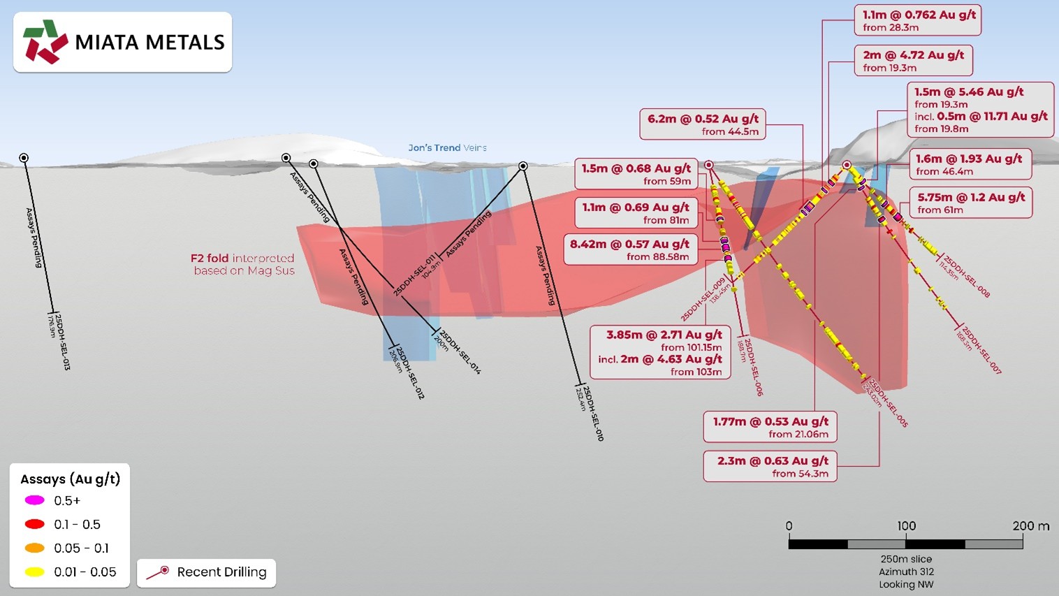 Figure 1. Section showing Golden Hand drill collars with assays as well as holes 25DDH-SEL-009 to 013, for which assays are pending. These holes were drilled at the potential intersection of the Golden Hand fold and Jon’s Trend veins.