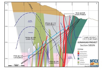 VANCOUVER, BC, May 21, 2025 /CNW/ – NGEx Minerals Ltd. (“NGEx”, “NGEx Minerals” or the “Company”) (TSX: NGEX) (OTCQX: NGXXF) is pleased to announce the discovery of a major new copper-gold porphyry system at its 100% owned Lunahuasi high-grade copper-gold-silver project in San Juan, Argentina. This discovery confirms our interpretation of the geological setting of the Lunahuasi mineralization and opens up an entirely new, very large-scale exploration target at the project. Drillhole DPDH027 demonstrates that the Lunahuasi system has similar size and scale potential to other deposits in the Vicuña cluster, with the added advantage of the large, very high-grade copper-gold-silver high-sulphidation (“HS”) epithermal structures which are unique to Lunahuasi. PDF Version