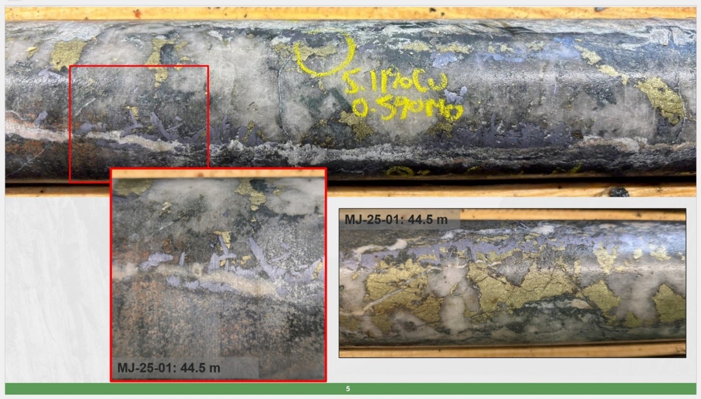 Figure 1. Chalcopyrite and molybdenite mineralization at 44.5m depth grading 3.42% Cu, 2.28% Mo, 0.034 g/t Au and 11.1 g/t Ag in hole MJ-25-01.
