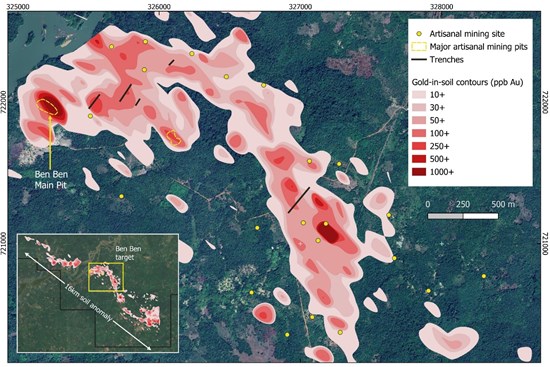 Map 1: Gold-in-soil anomaly at the Ben Ben target with trench locations and artisanal workings