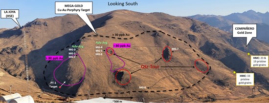 Figure 2 – Photo looking south showing the three principal target areas that make up the La Joya Project – 1) La Joya (HSE), 2) Mega-Gold intrusive center, and 3) Compañero gold zone. Black dots show location of initial scout holes drilled at Mega-Gold in 2024.