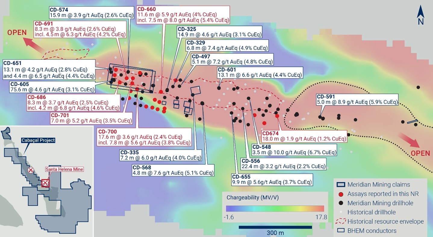 LONDON, UK / ACCESS Newswire / June 10, 2025 / Meridian Mining UK S (TSX:MNO),(Frankfurt/Tradegate:2MM)(OTCQX:MRRDF) (“Meridian” or the “Company”) is pleased to provide an update on its Santa Helena Au-Cu-Ag & Zn project (“Santa Helena”). Multiple intersections of shallow high-grade Au-Cu-Ag & Zn mineralization have been drilled as part of Santa Helena’s expanded resource delineation drill program1.