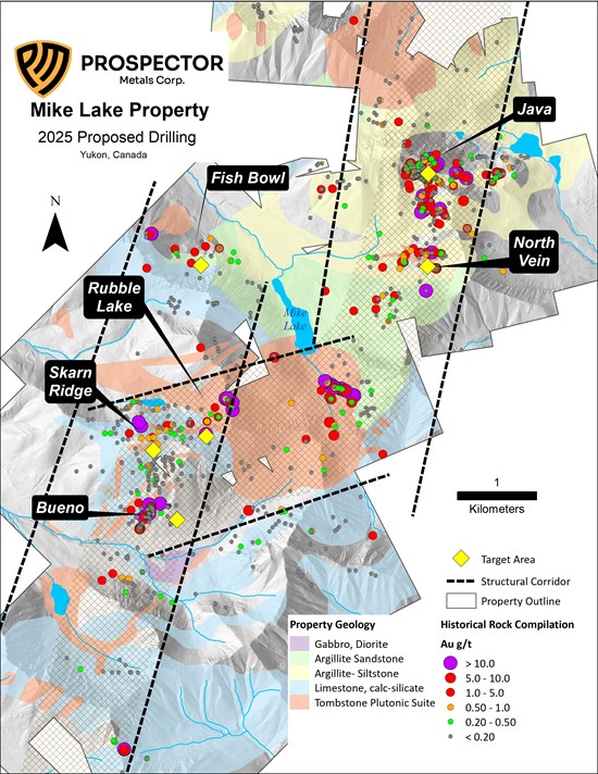 The 2025 ML Drill Program will consist of up to 5,000m of diamond drilling, over 15 – 20 holes, on 6 target areas including: Bueno, Skarn Ridge, Rubble, Fishbowl, Java, and North Vein. The drilling is targeting high-grade, structurally controlled, gold mineralization hosted in both intrusive units and adjacent calc-silicate/hornfels altered meta-sediments based on reinterpretation of the targets during review of the 2024 work program and historical data. The initial drilling has commenced on the Bueno target where the Company recently reported rock samples from historic trenches and surrounding areas up to 156 g/t Au (1). At Bueno the drilling is targeting a series of NE, steeply dipping, structures associated strong fracturing, quartz veining, brecciation, and disseminated to massive arsenopyrite (+/- chalcopyrite – pyrrhotite) mineralization.