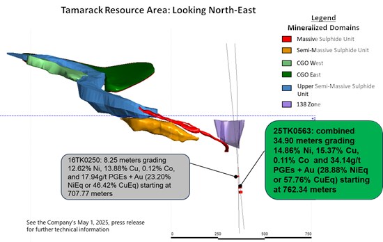 Tamarack, Minnesota–(Newsfile Corp. – June 5, 2025) – Talon Metals Corp. (TSX: TLO) (OTC Pink: TLOFF) (together with its subsidiaries, “Talon” or the “Company”), the majority owner and operator of the Tamarack Nickel-Copper-Cobalt Project (“Tamarack Nickel Copper Project“) in central Minnesota, is pleased to announce assays from the previously announced historic massive sulphide (“MSU“) intercepts in drill hole 25TK0563 (see the Company’s press release dated May 12, 2025) measuring a combined 34.9 meters grading 28.88% NiEq and 57.76% CuEq at the Tamarack Nickel Copper Project.
