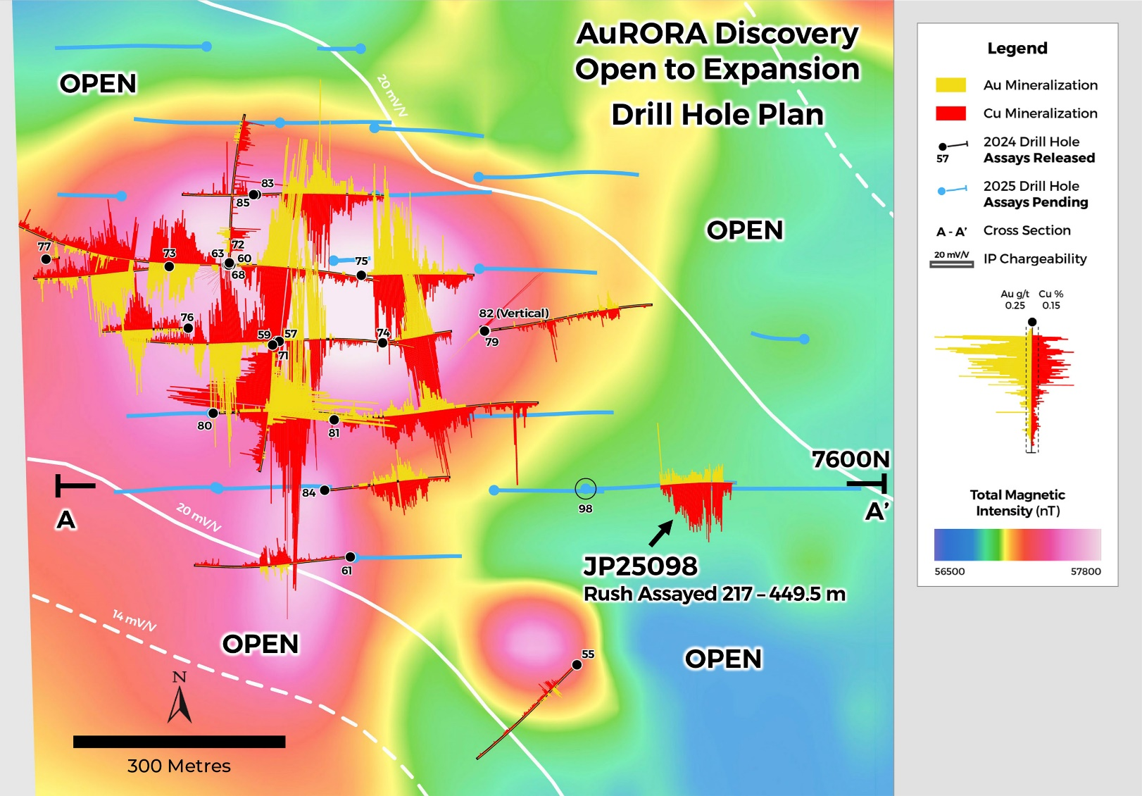 Hole JP25098 is being reported on a partial stand-alone basis because it returned results at a location that is viewed by management as being particularly important for revealing large-scale exploration potential across the entire JOY District. The Cu-Au-Ag mineralization in JP25098 occurs well outside the strong magnetic high that hosts the high grade AuRORA mineralization discovered in 2024. This occurrence of significant grade mineralization (159 m of 0.33% Cu, 0.43 g/t Au and 5.2 g/t Ag, Table 1) in JP25098, in rock with a comparatively weak magnetic signature and coincident with a strong Induced Polarization chargeability response, indicates that exploration targets at JOY are not restricted to strong magnetic highs. This knowledge opens exciting potential for eventual development of a world class porphyry Cu-Au district at JOY.