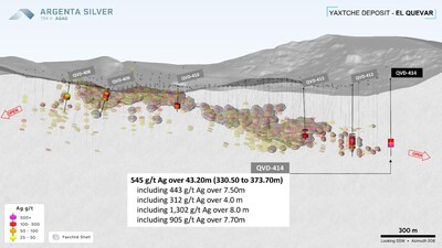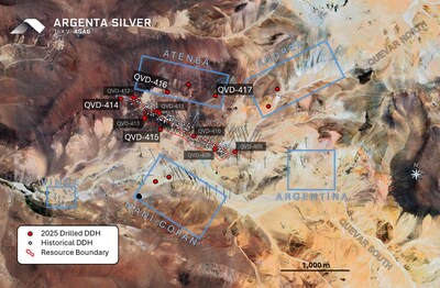 VANCOUVER, BC, Sept. 23, 2025 /CNW/ – Argenta Silver Corp. (TSXV: AGAG) (OTCQB: AGAGF) (FSE: T1K) (“Argenta” or the “Company”) is pleased to report the third batch of assay results from its 2025 winter diamond drilling program at the 100% owned El Quevar Project in Salta Province, Argentina. These results indicate ongoing continuity of the Yaxtché Deposit for 70 meters to the northwest (step-out hole QVD-414) extending the known mineralized footprint, while additional drill results highlight a promising new exploration target named Atenea. The 2025 Winter Drill Program has been completed, and the company is already working on plans for the upcoming summer drill season. Remaining results from the 2025 Winter Program are still pending.