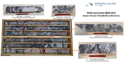 - QVD-414 – step-out success: 545 g/t Ag over 43.20 meters, including 1,302 g/t Ag over 8.00 m and including 905 g/t Ag over 7.70 m, extending the resource zone to the northwest. *