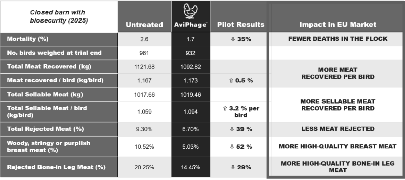 The purpose of this follow-up study was to evaluate the efficacy of AviPhage on European poultry within a working-barn setting. AviPhage-treated birds showed lower mortality and produced higher quality meat per bird compared to the control group birds. Overall, AviPhage’s broiler chickens matched or outperformed control group chickens on several key performance indicators, resulting in substantial improvement in the quality and quantity of the sellable meat which can have a direct economic impact for poultry producers.