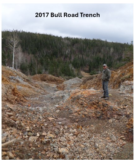 Great Atlantic and Unity Resources Inc. confirmed high-grade zinc, lead and copper mineralization plus silver and gold mineralization at a 2017 trench at the Bull Road Showing. Great Atlantic and Unity Resources Inc. samples at this trench included (Great Atlantic news release of December 14, 2017):
