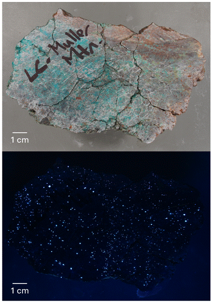 Figure 3.Visible light and ultraviolet (UV) light view of copper oxide and scheelite rich skarn from the Muller Mountain area.
