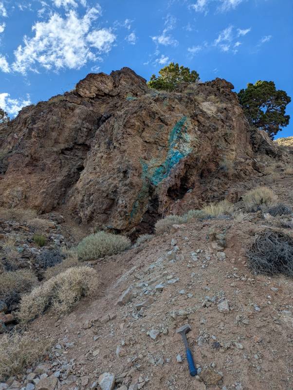Figure 1.Example of copper oxide rich garnet skarn outcropping on the Pilot North project.