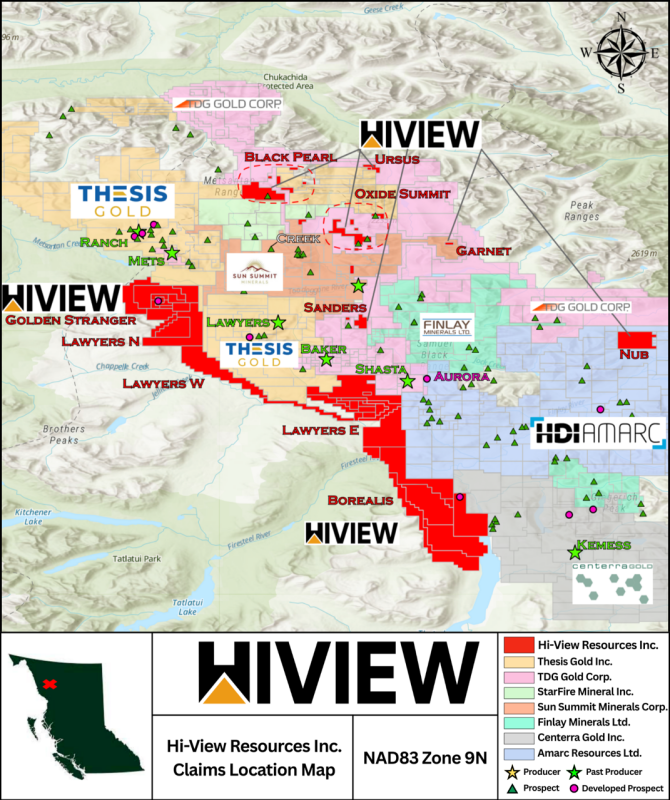 Hi-View Resources Inc. is a mineral exploration company targeting gold, silver, and copper in the Toodoggone region of northern British Columbia, Canada. Its 100% owned properties span over 18,855 hectares, including the Golden Stranger Project, the Lawyers North, West, and East Projects, and the Borealis Project. Additionally, the Company has under option the Saunders and Nub properties (1,083.5 hectares) and Black Pearl, Oxide Summit, Urus, Garnet Properties (1912.46 hectares). The Golden Stranger project is fully permitted with 45 drill-ready sites. Historical drilling highlights include 10 meters at 11.55 g/t gold, a historical resource estimate, sampling yielding up to 111.5 g/t gold and 2,740 g/t silver, with new mineralized zones identified 1.3 km from the main showings, indicating significant exploration potential. For further details, check Hi-View’s official website or recent filings on SEDAR+ (www.sedarplus.ca).