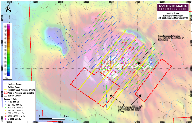 Northern Lights CEO, Jason Bahnsen, commented “We are pleased to start the field exploration program at Horetzky. We have contracted a geophysical company to complete the IP program in October. This new IP data, together with extended surface sampling and alteration mapping will be invaluable for future drill targeting.”