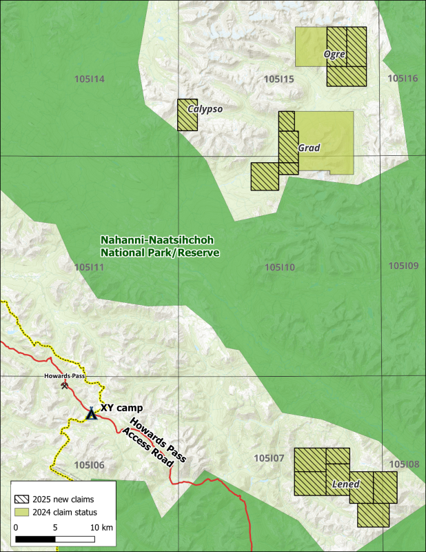 Rackla staked an additional 15 mineral claims expanding its landholdings from 7,525 hectares to 23,175 hectares in the area of the O’Grady Batholith (Figure 1). The Grad property was expanded from 5,525 hectares to 8,625 hectares and the Ogre Property was expanded from 2,000 hectares to 5,750 hectares. The Company added the Calypso property (1 claim, 1,000 hectares) and the Lened property (7 claims for 7,800 hectares).