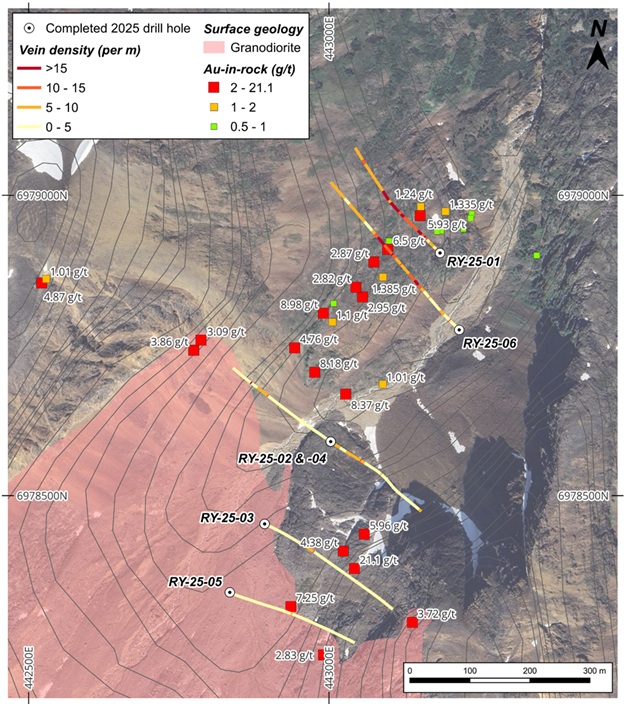 Prospecting and rock sampling at Rye, which was performed alongside the 2025 drill program, continued to identify sheeted, gold bearing veins within the Itsi intrusion and the surrounding hornfelsed siliciclastics. Gold analysis for the final batch of 28 rock samples has been completed, while the Company awaits geochemical analysis for the remaining metals of interest. Several outcrop samples within this batch collected within the meta-sedimentary rock, in the vicinity of holes RY-25-01 and RY-25-06, yielded assays greater than 2 g/t gold, including a highlight value of 8.98 g/t gold. Rock samples of semi-massive arsenopyrite veins developed within the Itsi granodiorite yielded up to 3.72 g/t gold (Figure 1).