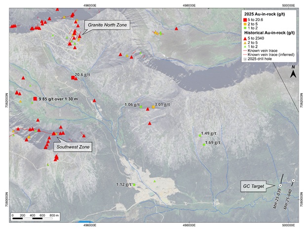 In 2025, the Company also performed limited prospecting and rock geochemical sampling in the lead-up and throughout the drill program. Specific attention was paid to vein exposures in the floor of Granite Creek and within an operating placer mine, which may represent strike extensions of delineated, gold-bearing veins in cliffy exposures to the east and west.