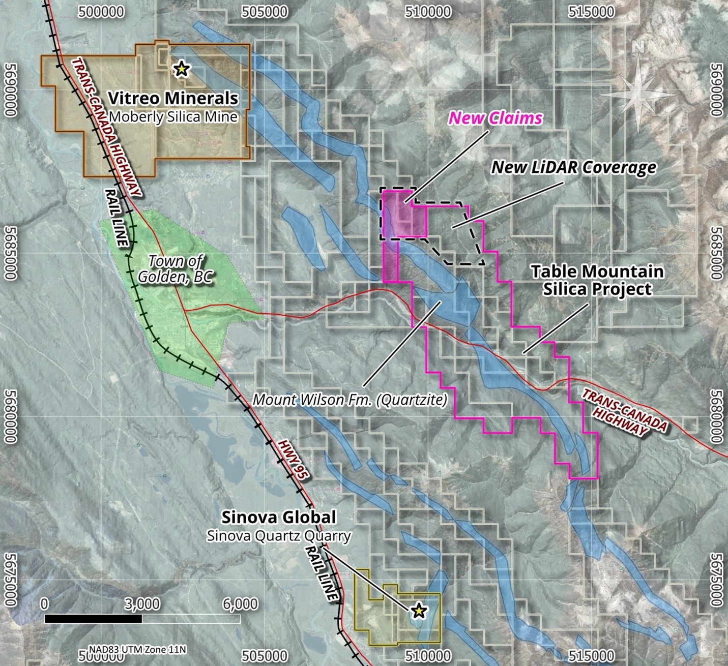 The Table Mountain Silica Project is located approximately 4 kilometers east of Golden, B.C., Canada, with excellent year-round road access and proximity to the Canadian Pacific Railway’s Golden rail yard. The property covers roughly 2,526 hectares, encompassing up to 11 kilometers of regionally mapped strike length of the Mount Wilson Formation quartzite, with widths ranging from 300 to 1,400 meters at surface. Table Mountain is strategically situated near two established high-purity silica operations – the Moberly Silica Mine and the Sinova Quartz Quarry – both of which demonstrate silica purity greater than 99.6% SiO₂. This advantageous location highlights the project’s potential to become a significant source of high-purity silica in a region known for hosting premium-quality silica deposits.