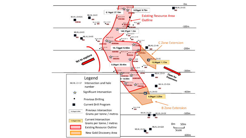 MLHL-23-50: 13.96 g/t Au over 1.17m and MlHl-24-53: 4.04 g/t Au over 2.25m.