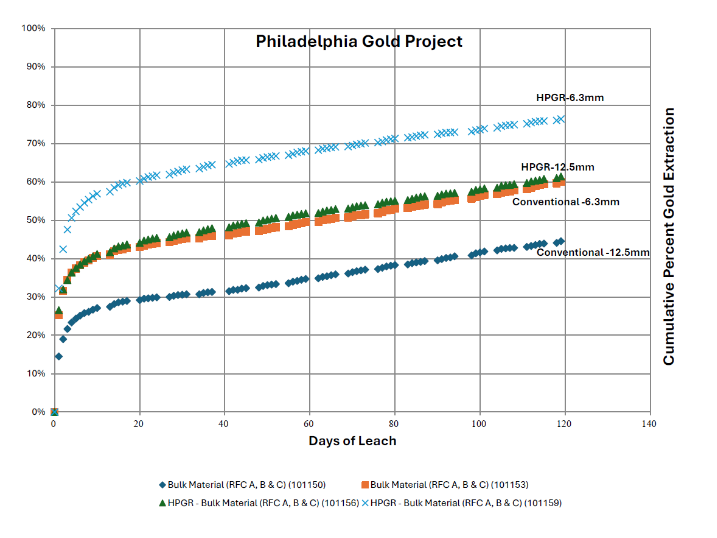 After 119 days of leaching the bulk sample crushed by HPGR (high pressure grinding rolls) to -6.3mm (-1/4 inch) has achieved 76% recovery on gold and 40% recovery on silver.