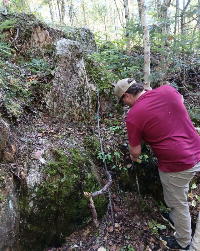 The Santa-Maria 1 pit is located just North-West of the Lee-Lake occurrence along the same logging road. Host rock outcrops on either side of the logging road. The Santa-Maria pit was visited, and is mostly filled or caved in, with two visible quartz veins running into the east side wall. A 12 inch wide quartz vein was sampled, with trace galena observed in clusters, as well as trace chalcopyrite and pyrite.