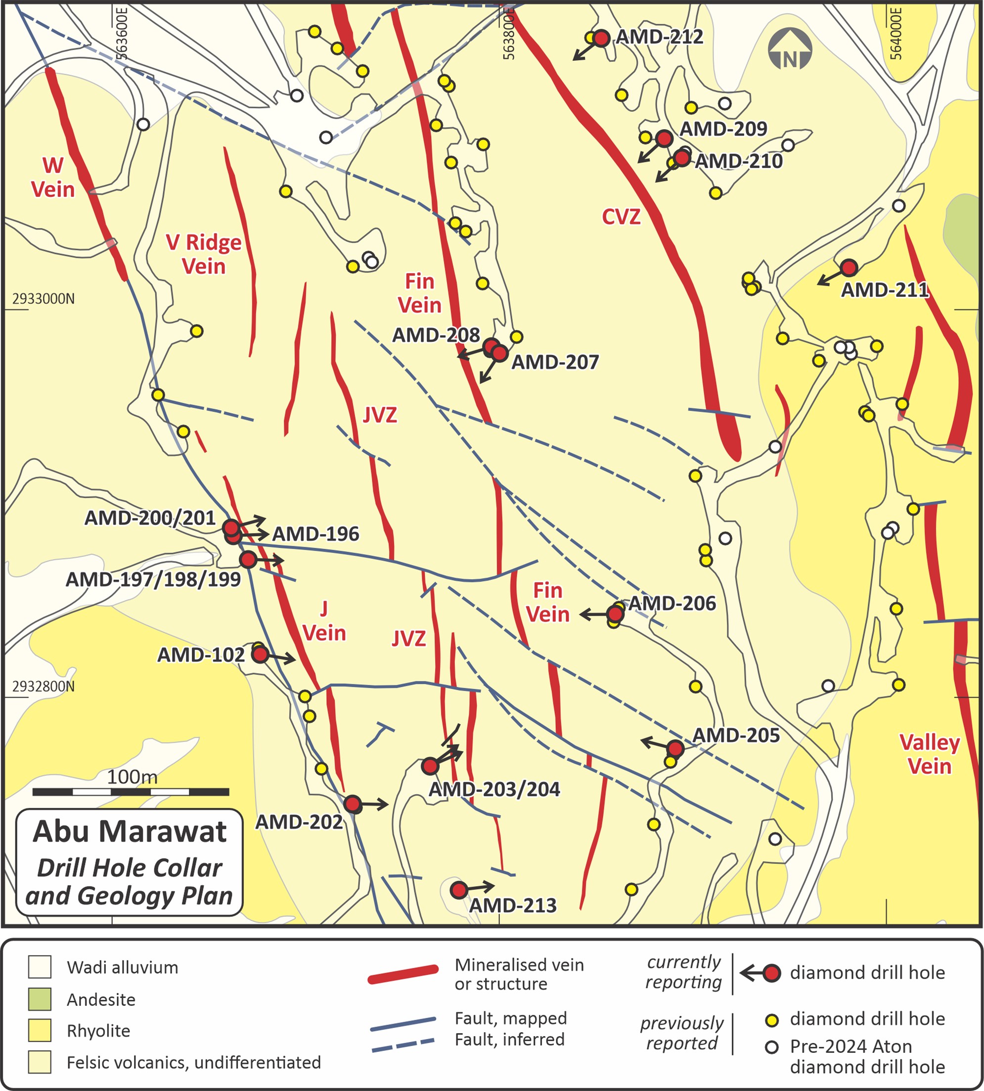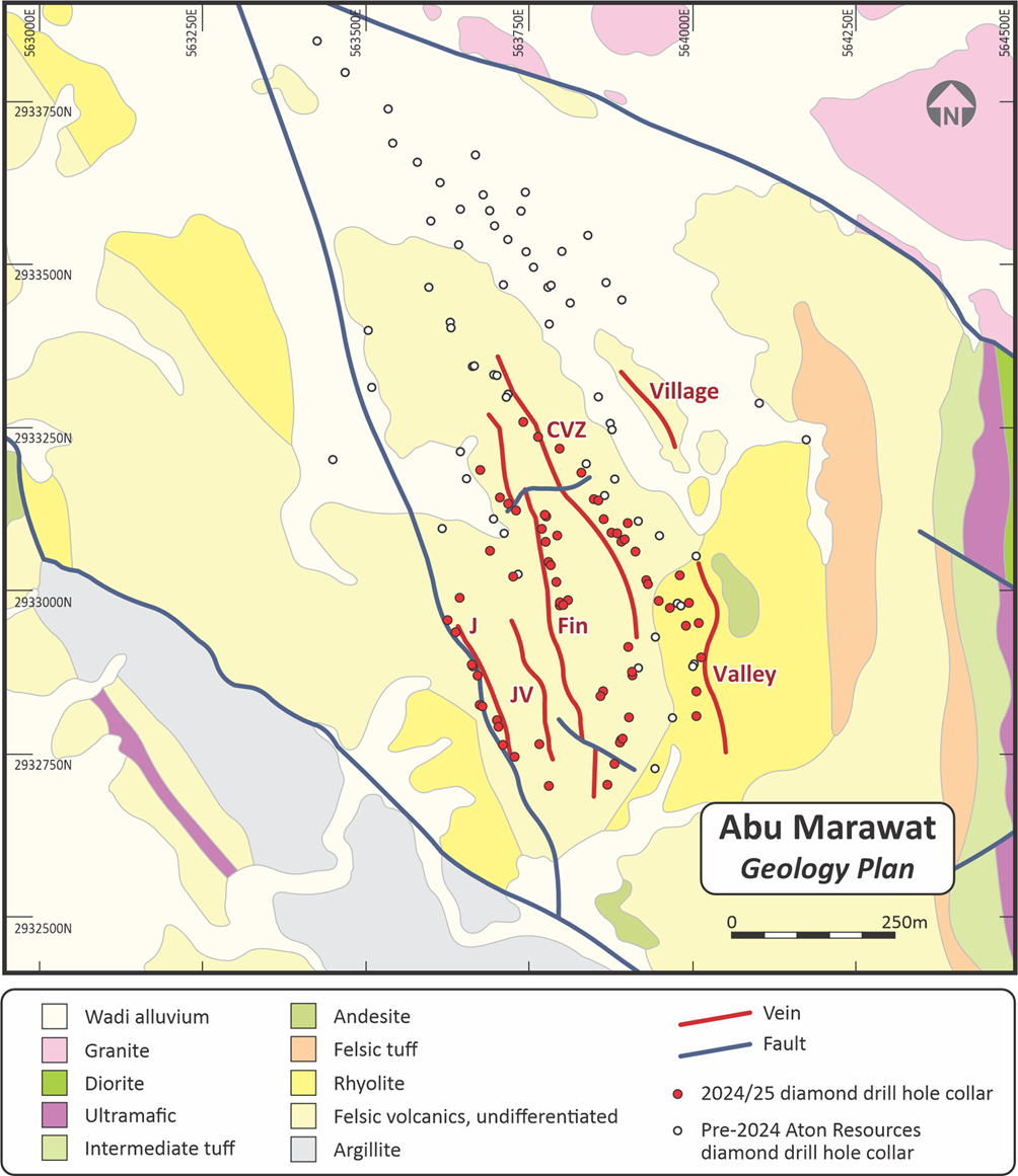 The polymetallic mineralisation at Abu Marawat is interpreted as being mesothermal in origin, and occurs in a series of discrete and roughly parallel N-S to NNW-SSE trending veins and structures, of which the Fin Vein and the CVZ are the most significant, hosted within a sequence of intensely hydrothermally altered, felsic metavolcanic rocks (Figure 2). The Fin Vein and the CVZ are about 50-100m apart and have been traced for at least 800m in surface outcrop and drill holes. Aton’s previous drilling has demonstrated that these structures extend to at least 200m in depth. The bulk of the Inferred Mineral Resource at the Abu Marawat deposit encompasses parts of the CVZ and the Fin Vein, but there are also other subparallel mineralised veins to the east and to the west of these structures, such as the J Vein, the JVZ structure, and the Valley Vein zone (Figure 2).