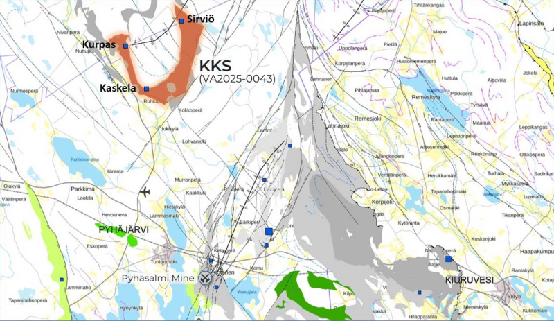 Figure 1. Location of the KKS reservation area (orange), 15-20 kms NNW of the Pyhäsalmi Mine. Gray areas are prospective volcano-sedimentary sequence units.