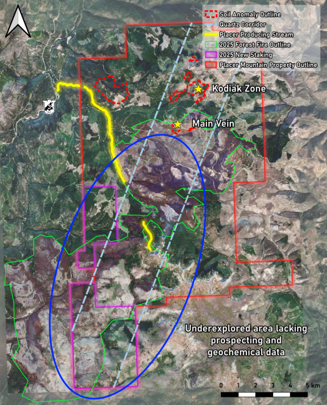 Logging roads and areas affected by forest fires provide significant advantages to exploring Placer Mountain. The Main Vein was first discovered in 2008 through prospecting along newly pushed logging roads. Following up on the Main Vein discovery, the Kodiak Zone was disovered in logged areas providing easy access for field crews. The areas south of the Main Vein have had little to no historic exploration and limited mapping. The Company plans to have crews prospect the newly burnt areas where vegetation has been removed.