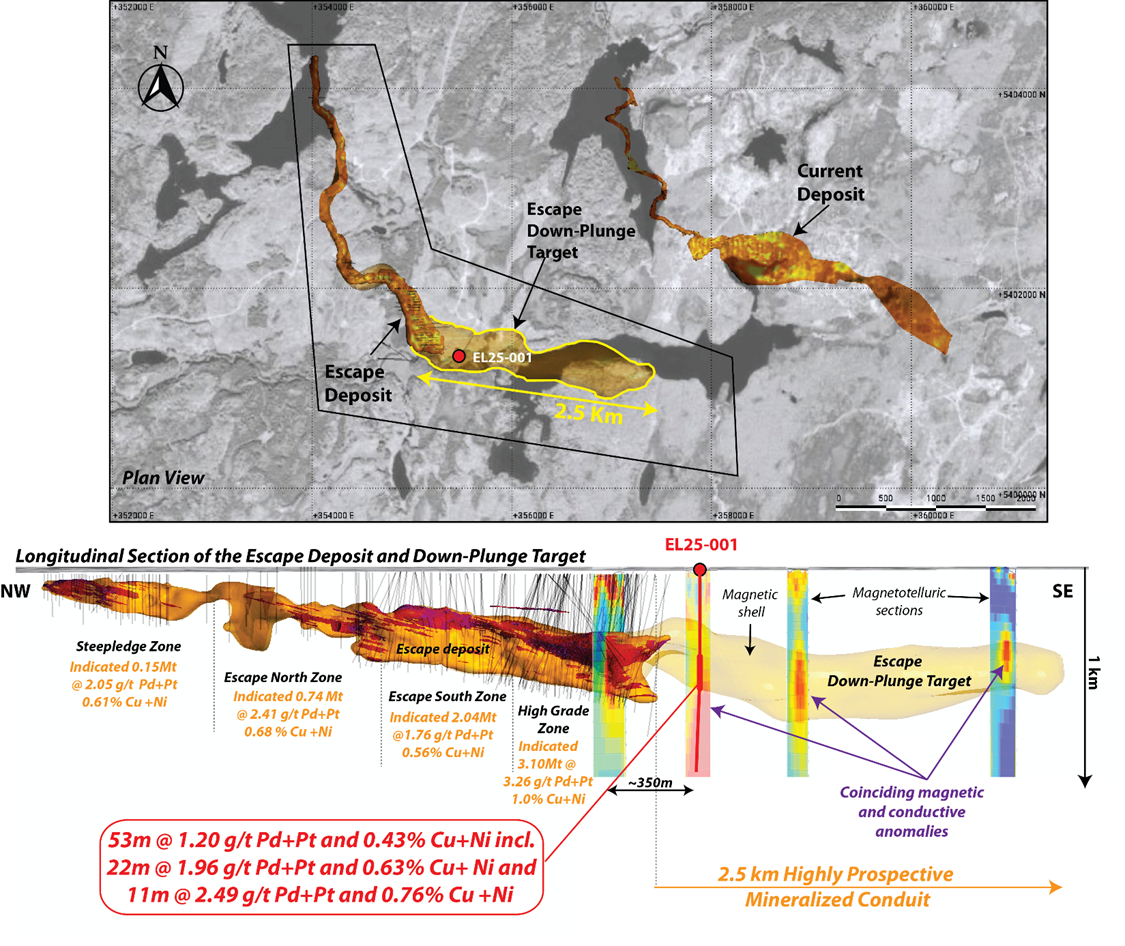 Figure 1. Plan view and longitudinal sections of the Escape Deposit and Down-Plunge Target illustrating the mineralized intercepts in drill hole EL25-001 relative to the modelled extension of the known resource. Also shown are the locations of untested magnetic and conductive anomalies distributed along the 2.5-kilometre highly prospective mineralized conduit.