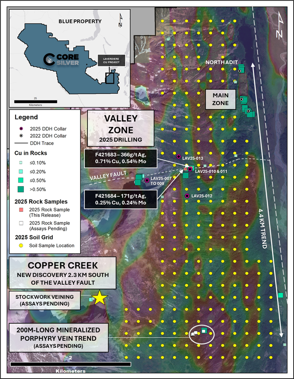 Core Silver’s 2025 exploration program was designed to evaluate the mineralization potential of an extensive (5km x 8km) Cu-Mo-Ag±Au-bearing porphyry intrusion at the Laverdiere Copper Project through prospecting, detailed structural mapping, regional soil sampling and deep exploratory diamond drilling (Figure 1).