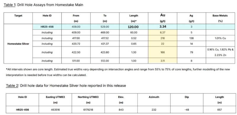 Hole HR25-456 intersected 3.34 g/t Au over 120 meters, including 216 g/t Au over 0.52 meters and 166 g/t Au over 1.3 meters.