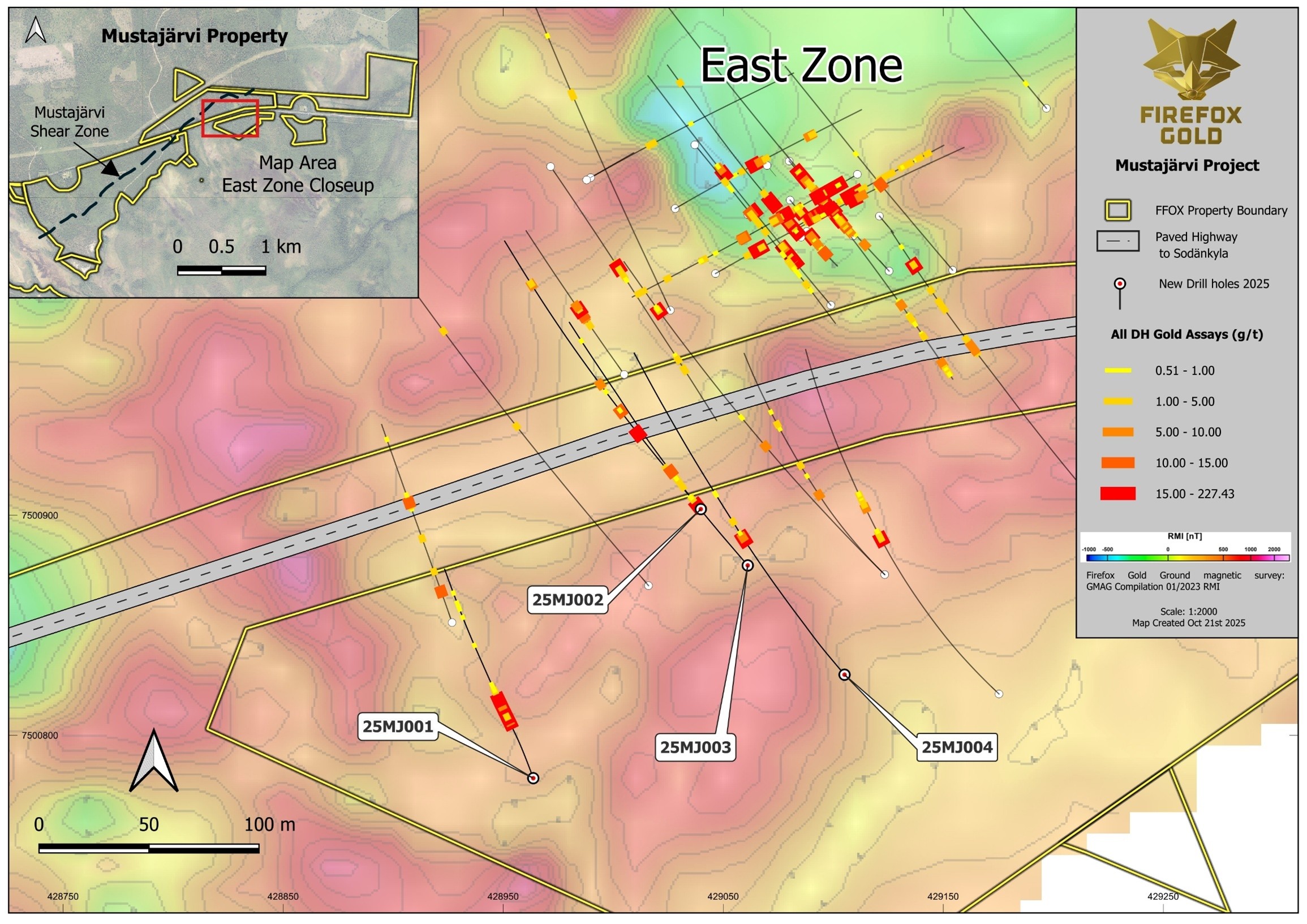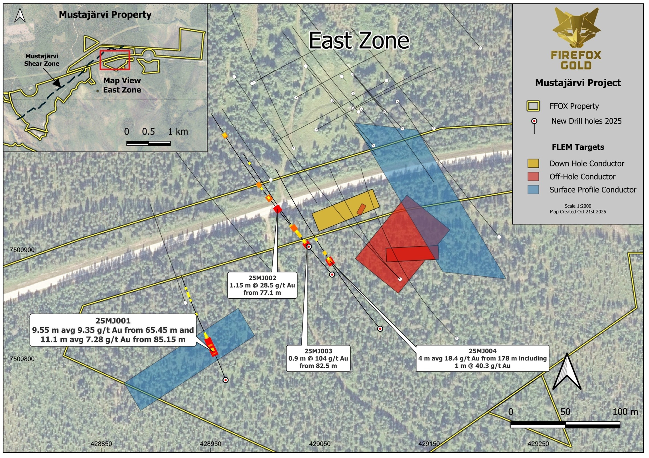SODANKYLÄ, FINLAND / ACCESS Newswire / October 27, 2025 / FireFox Gold Corp. (TSX.V:FFOX)(OTCQB:FFOXF)(“FireFox” or the “Company“) is pleased to report the results from the first four holes of its 2025/26 diamond drilling program at the Company’s 100%-held Mustajärvi Gold Project in Lapland, Finland. One of the key early goals of the drill program was to test targets identified in the fixed loop electro-magnetic (FLEM) geophysical surveys from earlier this year. Drill hole 25MJ001 tested one of these interpreted conductors, located nearly 280 metres southwest from the centre of the East Zone (See Figure 1). The hole penetrated a thick interval of strong gold mineralization associated with abundant pyrite including: