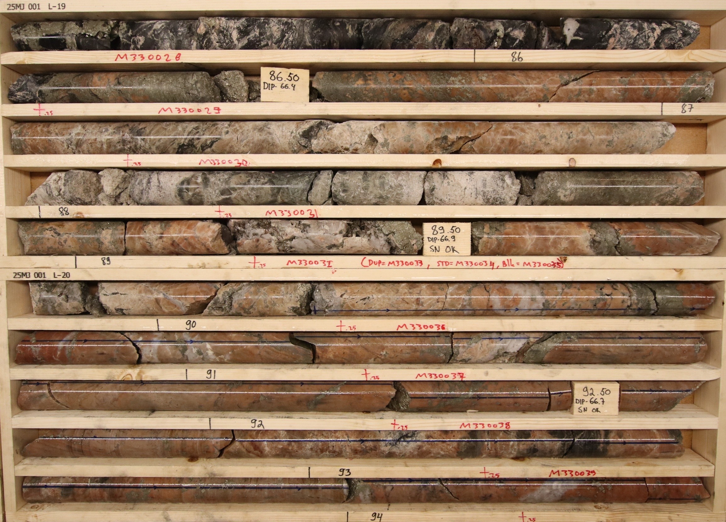 25MJ003 was collared 33 metres southeast from the 25MJ002 and it crossed the faulted contact zone at 63.5 metres downhole. Several high-grade intervals were intersected, including 0.9 metres at 104 g/t Au from 82.5 metres, 6.85 metres at 1.95 g/t Au from 112.45 metres and 3.2 metres at 7.2 g/t Au from 124.8 metres downhole. These mineralized intervals were primarily related to variable QCTP veining and occasional clots of semi-massive and disseminated pyrite within strong albite altered metasediments.