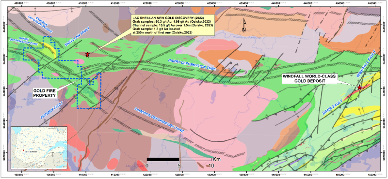 Of note, gold mineralization of the Windfall gold deposit (42km east of the Goldfire) is characterized by two types of gold mineralization: 1) quartz-carbonate lode gold veins and 2) gold silica-carbonate replacement. All gold mineralization is a structural control related to shear zones, with fractures and tension gashes, and with the contact zone between felsic intrusions (QFP) and the different competence of the host rocks (rheology). The alterations associated with the Windfall gold mineralization are the same as alterations observed at Goldfire . Also, of note is a 90.3 g/t gold grab sample and 15.5 g/t gold over 1.5m from a channel sample which was found by Osisko Mining in 2022 and located 1.7 km from the northeast corner of Goldfire .