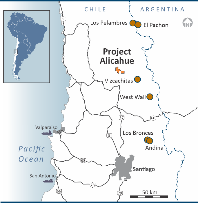 The Project is located at an altitude of approximately 1,700 metres in the Andean Cordillera, just 140 km north of Santiago and 6 km from paved road access (Figure 1). The project covers 3,500 hectares of mining concessions in a northwest (“NW”) and southeast (“SE”) block. The area is surrounded by mining companies such as Newmont Gold Corp., and Los Andes Copper Ltd. The project area has never been subjected to systematic copper exploration until recent years. The Vendor assessed the area for copper potential and used historical (BRGM) stream sediment anomalies as a starting point for systematic, traditional exploration. Values of up to 407 ppm Cu and 130 ppb Au in stream sediments are found in the area. Exploration work to date has included geological mapping, and rock and soil geochemistry.