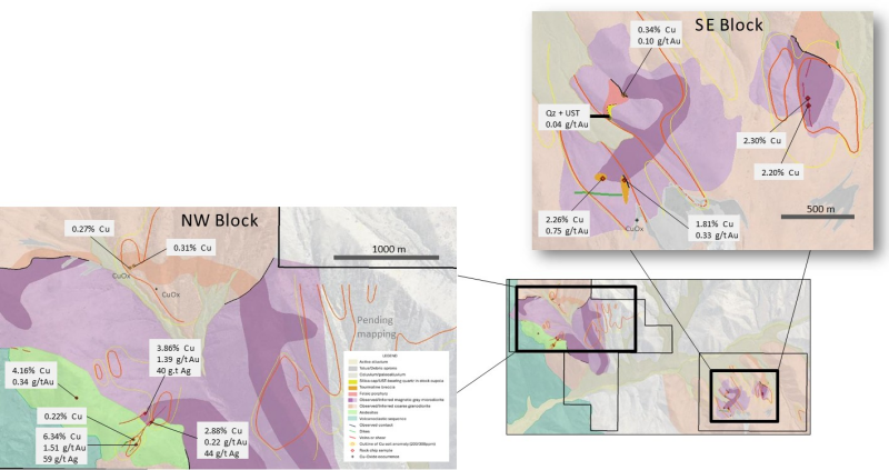 Mapping in the NW block has identified mineralization that Grafton Resources management believes has the potential for bulk, disseminated copper mineralization in the north and high-grade Cu-Au-Ag IOCG-shear zone to southwest. In the SE block, Grafton Resources management believes that there is potential for deeper porphyry-copper deposit formation, as indicated by the presence of UST textures, tourmaline breccia pipes and epithermal veins.