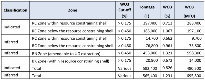 In 2018, Happy Creek published a NI43-101 Resource Estimate for the Fox Tungsten Project. The resource estimate included an Indicated Resource of 582,400 tonnes at 0.826% WO3, all located within the RC Zone. The 2018 NI43-101 Resource Estimate also included an Inferred Resource of 565,400 tonnes at 1.231% WO3 located predominately at the BN Zone (453,000 @ 1.321 WO3). (See Happy Creek news release dated February 27, 2018 for full details, reference NI 43-101 Resource Update, Desautels and Berndt, April 9, 2018).