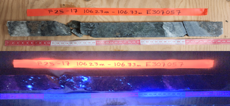 Photo 2 A/B: Drillhole F25 – 17, BN Zone Calc Silicate Horizon at 106 metre depth showing cut core with and without UV lighting indicating the presence of scheelite mineralization |