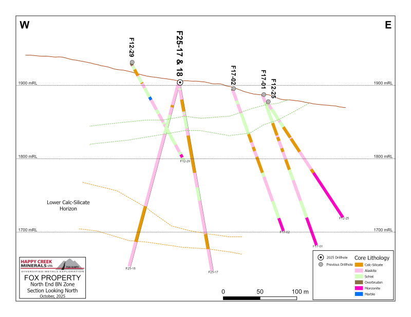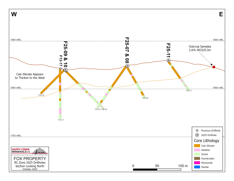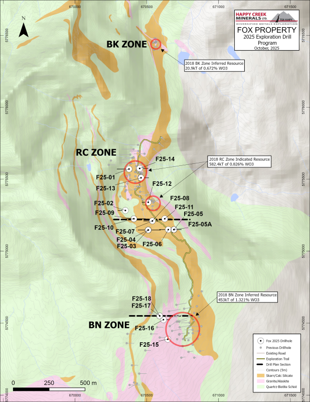 During the period from September 5 to October 5, 2025, Happy Creek completed 18 NQ diameter diamond core drill holes (total 2,175.5 metres) at the Fox tungsten Project focused on resource expansion at the RC and BN zones (See Figure 1 and Table 1 for details).