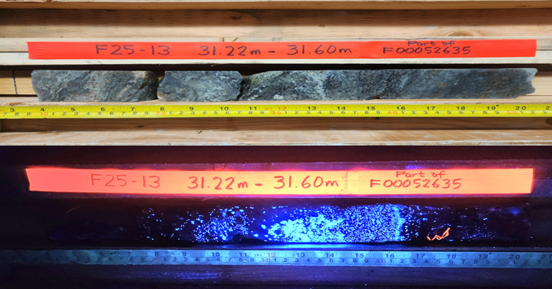 Photo 1 A/B: Drillhole F25 – 13, BN Zone Calc Silicate Horizon at 31 metre depth showing cut core with and without UV lighting indicating the presence of scheelite mineralization |