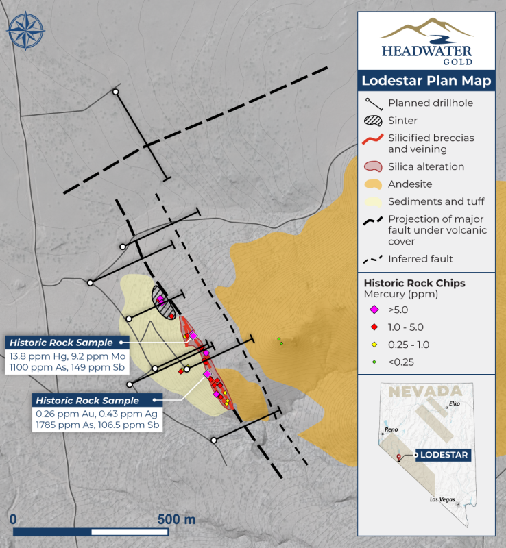 Caleb Stroup, President and CEO of the Company, states: “The start of drilling at Lodestar marks an exciting step for Headwater. The initial focus of this much anticipated program will be the Zodiac sinter target, where the geology and geophysics point to a well-preserved epithermal system with significant discovery potential. The program is designed to test both the structural feeders beneath the sinter and a series of geophysical anomalies elsewhere on the property for high-grade epithermal veins at depth. The endowment of the greater Aurora district, together with the intensity and character of the surface alteration at Lodestar, give our geologists a high degree of optimism as we kick this drilling off. With strong support in place from our funding partner, we are well positioned to advance Lodestar aggressively and test multiple high-priority targets in one of Nevada’s most prospective gold districts.”