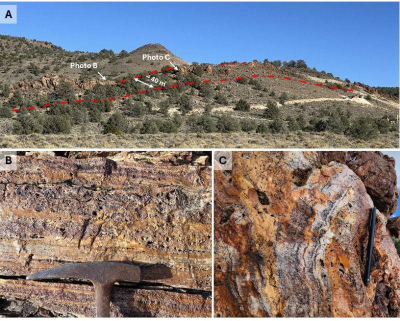 Figure 3: A) Looking east at core rig drilling on the Zodiac target with silica sinter in the foreground and silica ribs forming resistant ridge above the drill road; B) Alternating laminated, palisades, and clotted silica sinter textures; and C) Cross-cutting banded quartz veins in silicified rhyolite tuff.