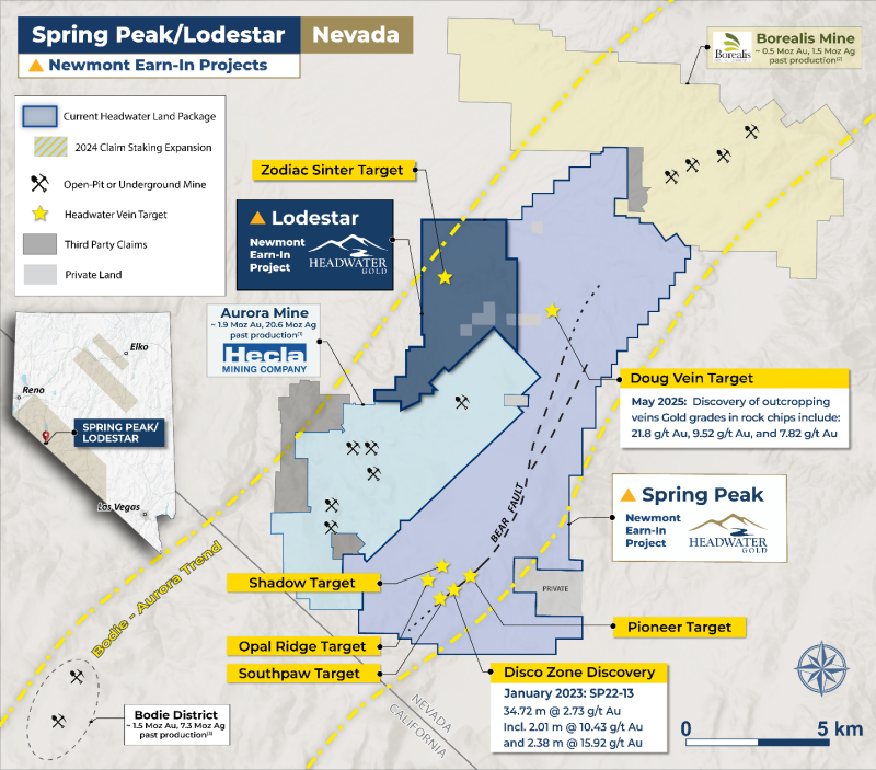 Headwater Gold Inc. (CSE: HWG, OTCQB: HWAUF) is a technically-driven mineral exploration company focused on exploring for and discovering high-grade precious metal deposits in the Western USA. Headwater is actively exploring one of the world’s most well-endowed, mining-friendly jurisdictions, with a goal of making world-class precious metal discoveries. The Company has a large portfolio of epithermal vein exploration projects and a technical team with diverse experience in capital markets and major mining companies. Headwater is systematically drill-testing several projects in Nevada and has strategic earn-in agreements with Newmont on its Spring Peak and Lodestar projects. In August 2022 and September 2024, Newmont and Centerra Gold Inc. acquired strategic equity interests in the Company, further strengthening Headwater’s exploration capabilities.