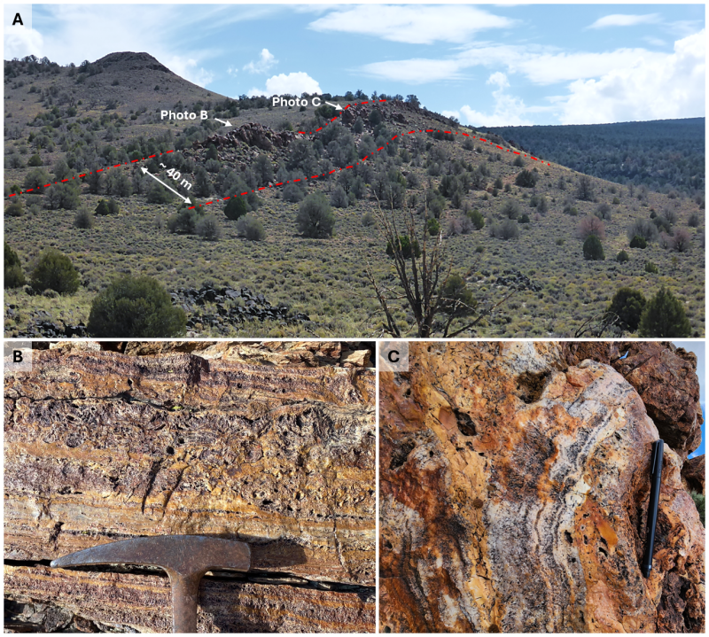 Figure 1: A) Looking southeast at the Zodiac target sinter and silica ribs forming a resistant ridge; B) Alternating laminated, palisades, and clotted silica sinter textures; and C) Cross-cutting banded quartz veins in silicified rhyolite.