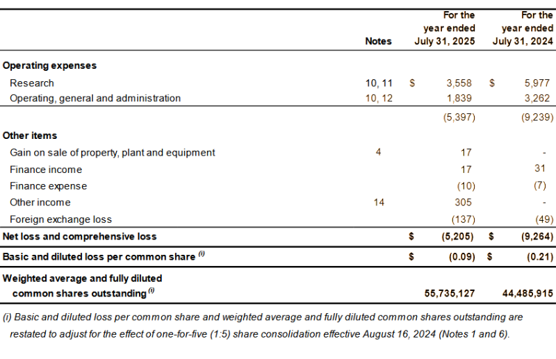 The Company reported a net loss and total comprehensive loss of $5,205,000 for the year ended July 31, 2025, (July 31, 2024: $9,264,000) and a loss of $0.09 per common share (July 31, 2024: loss of $0.21 per common share.