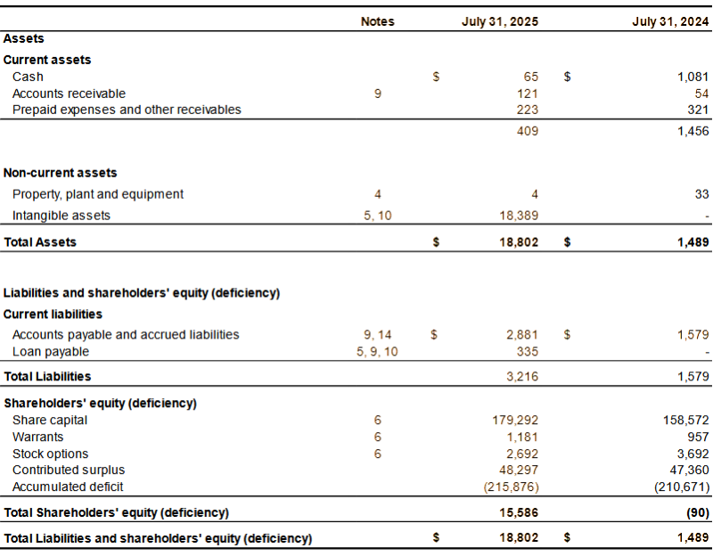 The Company reported a net loss and total comprehensive loss of $5,205,000 or $0.09 per common share for the year ended July 31, 2025, (July 31, 2024: $9,264,000 or $0.21 per common share). As of July 31, 2025, the Company had a working capital deficiency of $2,807,000, shareholders’ deficiency of $15,586,000 and an accumulated deficit of $215,876,000.