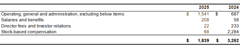 Operating, general and administration expenses for the year ended July 31, 2025, totaled $1,839,000 (2024: $3,262,000). The following table outlines operating, general and administration expenses for the current and comparative years (in thousands of Canadian dollars):