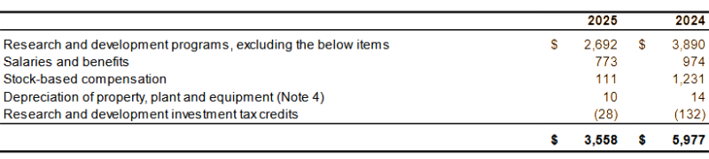 Research & Development expenses for the year ended July 31, 2025, totaled $3,558,000 (2024: $5,977,000). The following table outlines research and development cost expenses for the current and comparative year (in thousands of Canadian dollars):