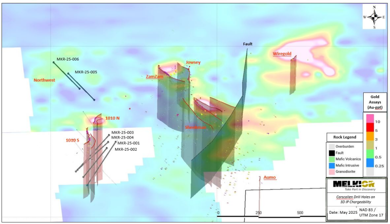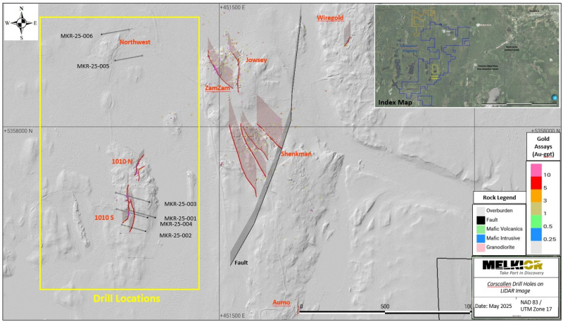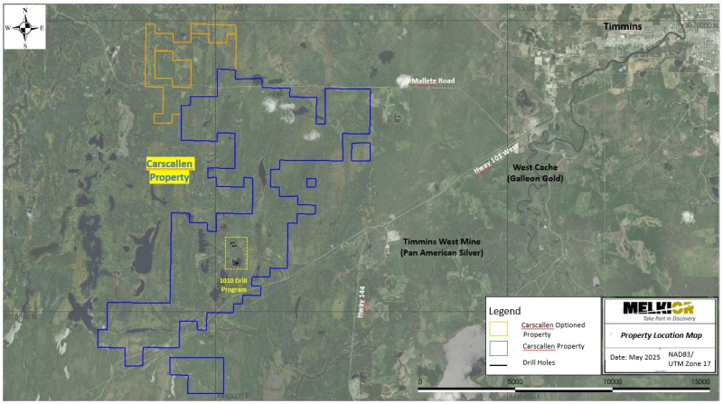 October 6, 2025 – TheNewswire – Timmins, Ontario – Melkior Resources Inc. (“Melkior” or the “Company”) (TSXV:MKR) (OTC:MKRIF) is pleased to announce an upcoming follow-up exploration drill program at the Carscallen Gold Property in Timmins. The 6-hole drill program has been designed with a total of approximately 1,725 meters to focus on expanding the strike and down-dip continuities of the NNW-SSE trend, 1010 Zone structural corridor, which includes testing new gold opportunities at the Northwest Prospect, all located about 25 kilometres west of the City of Timmins.