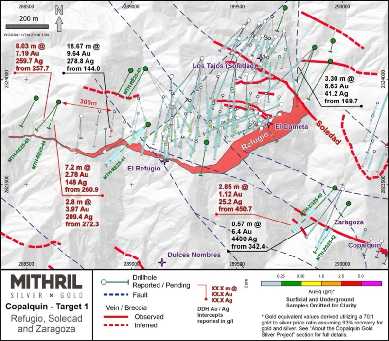 The resource drilling and 3D modelling at Target 1 have significantly refined the geological interpretation and definition of mineralized domains, with the completion of resource update drilling anticipated in early 2026. First drilling southeast of the resource area at Target 1 along the 2 km long Copalquin Structure intercepted 6.40 g/t gold, 4,400 g/t silver over 0.57m from 342.4m (MTH-ZG25-37), 160 m below the Zaragoza workings. The Copalquin Structure is developing as a key feature in the large epithermal gold-silver system.