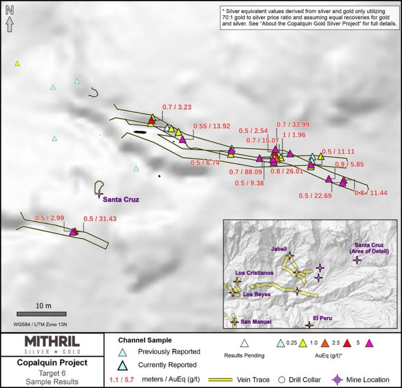 Figure 7 Channel sample results at the newly developing Target 6 (Santa Cruz historic mine area)